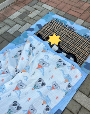 厚手のレジャーシートを敷いて、暖かいブランケットをかけて、屋外でお昼寝できました